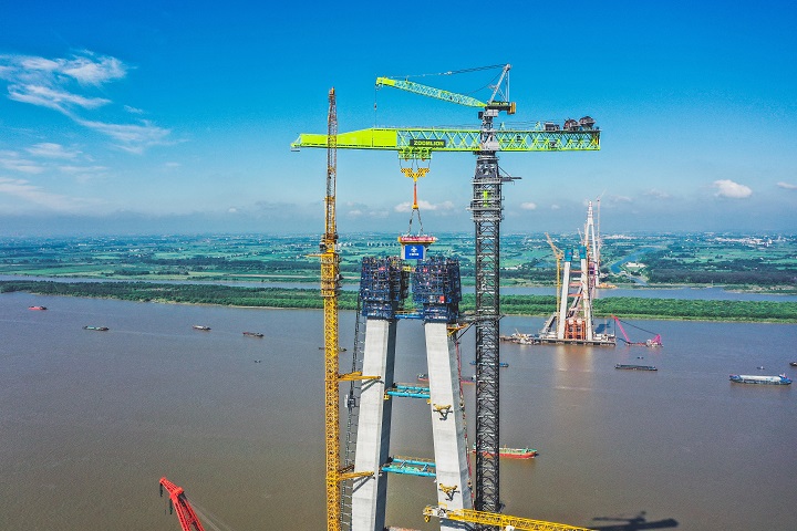 近日,在二航局承建的安徽巢马铁路马鞍山长江公铁大桥南主塔施工现场,全球最大塔式起重吊机顺利吊装完成世界最大跨度三塔斜拉桥南主塔首节段钢塔,标志着由二航局和中联重科集团联合研发的全球最大塔式起重机R20000-720正式投入使用。该塔式起重机最大起重量720吨,最大起升高度400米,相当于一次将500辆小轿车起吊至130层楼的高度。