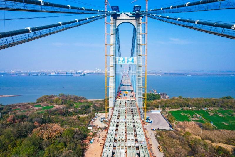 由中交二航局承建的第三标段,线路全长约9公里,包括鄂州侧主塔、锚碇、桥面、单双层引桥,以及下游侧主缆等施工内容。其中,主跨共设有69个梁段,已于今年11月22日顺利合龙。